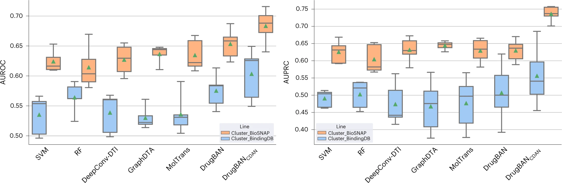 Adversarial Domain Adaptation, which helps the model generalise to out-of-distribution datasets, i.e., in clustering-based cross-validation instead of random splits, improving its ability to predict interactions on unseen drug–target pairs.